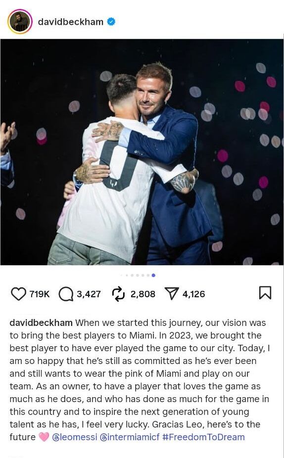 دیوید بکام، مالک باشگاه اینتر میامی، پس از تمدید قرارداد لیونل مسی با این باشگاه، در پستی در صفحه رسمی اینستاگرام خود به تمجید از فوقستاره آرژانتینی پرداخت.هدف ما از ابتدا این بود که بهترین بازیکنان را به اینتر میامی و به این شهر بیاوریم، و حالا دقیقاً همان کار را انجام دادهایم. ما بهترین بازیکن تاریخ فوتبال را به شهر خود آوردیم.