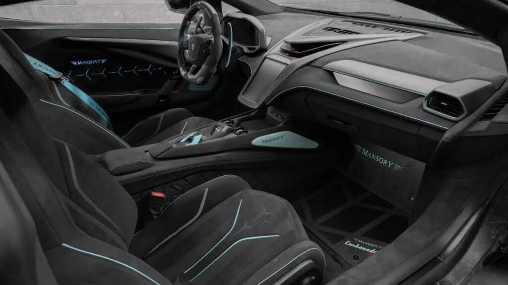 درون کابین لامبورگینی روئلتو منصوری، حالوهوای تیره بیرونی حفظ شده است. پوشش گسترده چرم آلکانترا با رنگ تیره، با رگههایی از رنگ فیروزهای و لوگوهای منصوری با نور پس زمینه در رودریها و صندلیها همراه شده است که تضاد جالبی را ایجاد کردهاند.